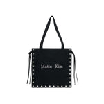 A cotton tote bag featuring logo print, eyelet hardware, and side knot details.