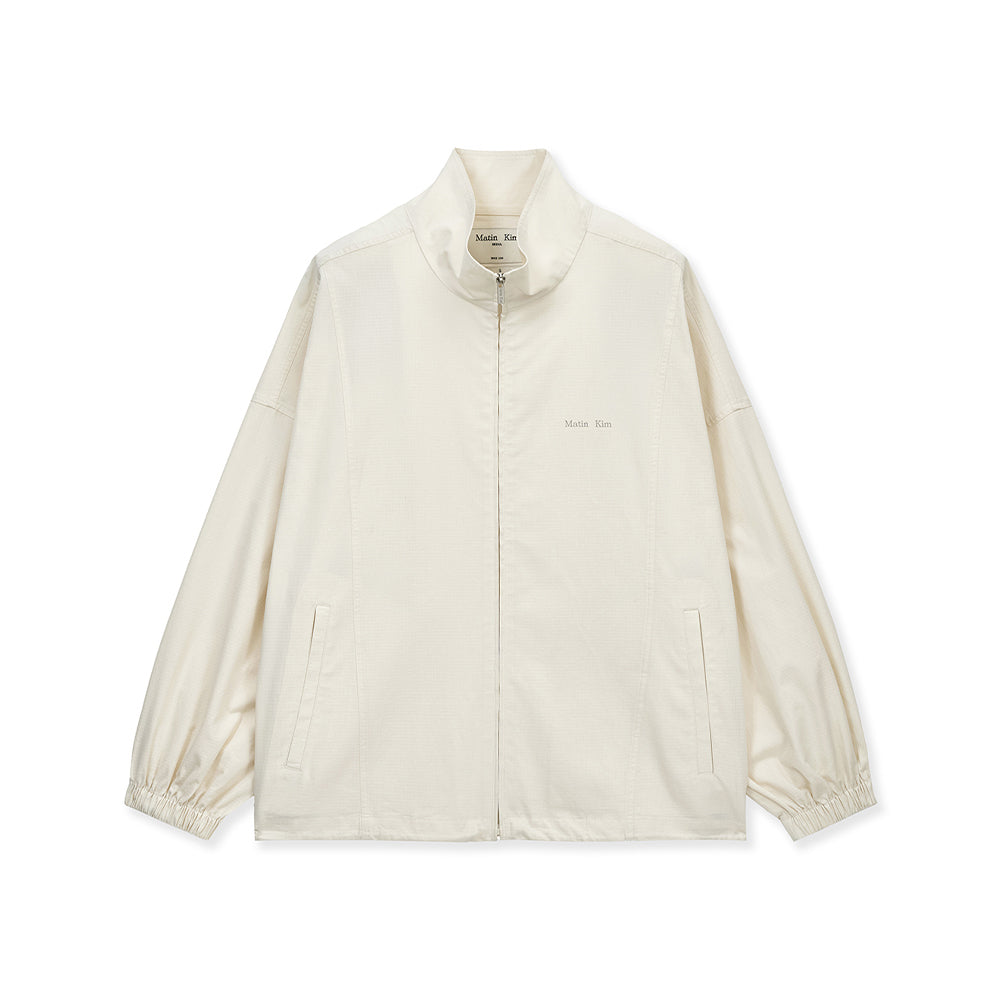 A high-neck oversized zip-up made from soft cotton, featuring logo accents on the front and back panels.