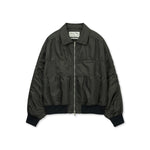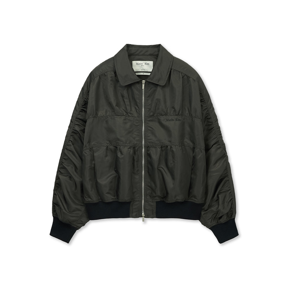 An MA-2 style jumper made from glossy nylon with shirring details.