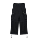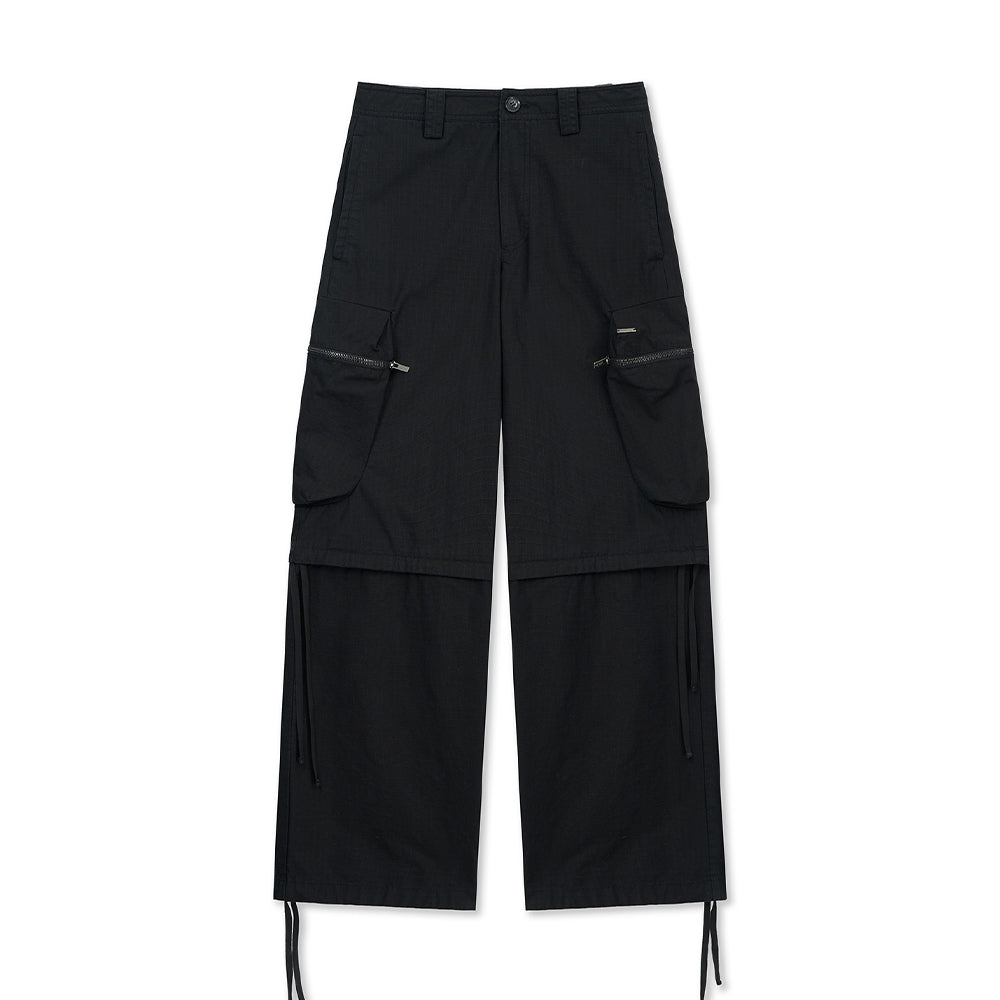 Overfit cargo pants with pocket details, featuring detachable hems that convert into bermuda pants, and hem drawstrings for easy size adjustment.