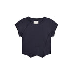 A slim-fit cropped T-shirt featuring asymmetrical details as the key point.