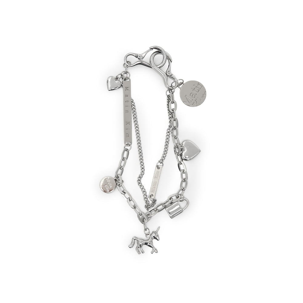 A unicorn heart chain strap that can be styled by attaching to the side handle rings of a bag or to pants.