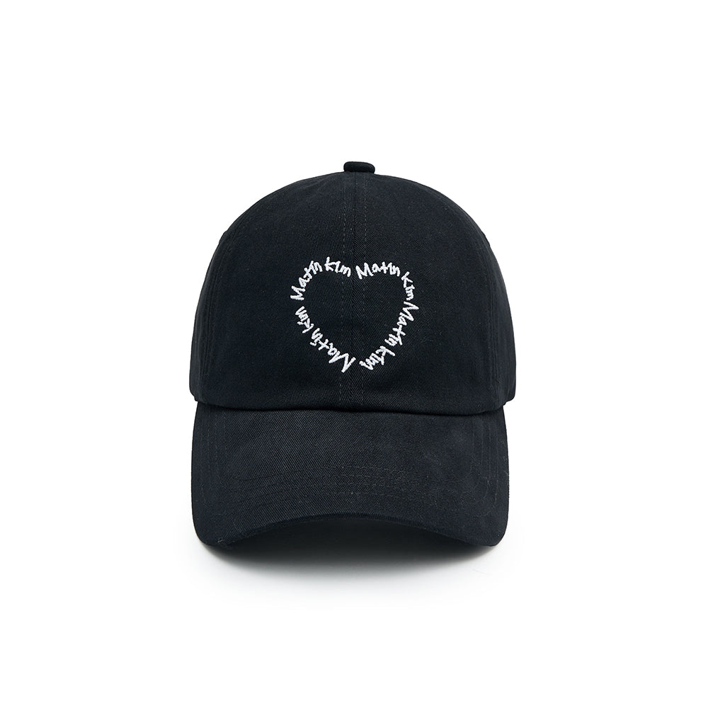A basic cotton twill ball cap featuring Matin Kim graffiti logo embroidered in a heart shape.